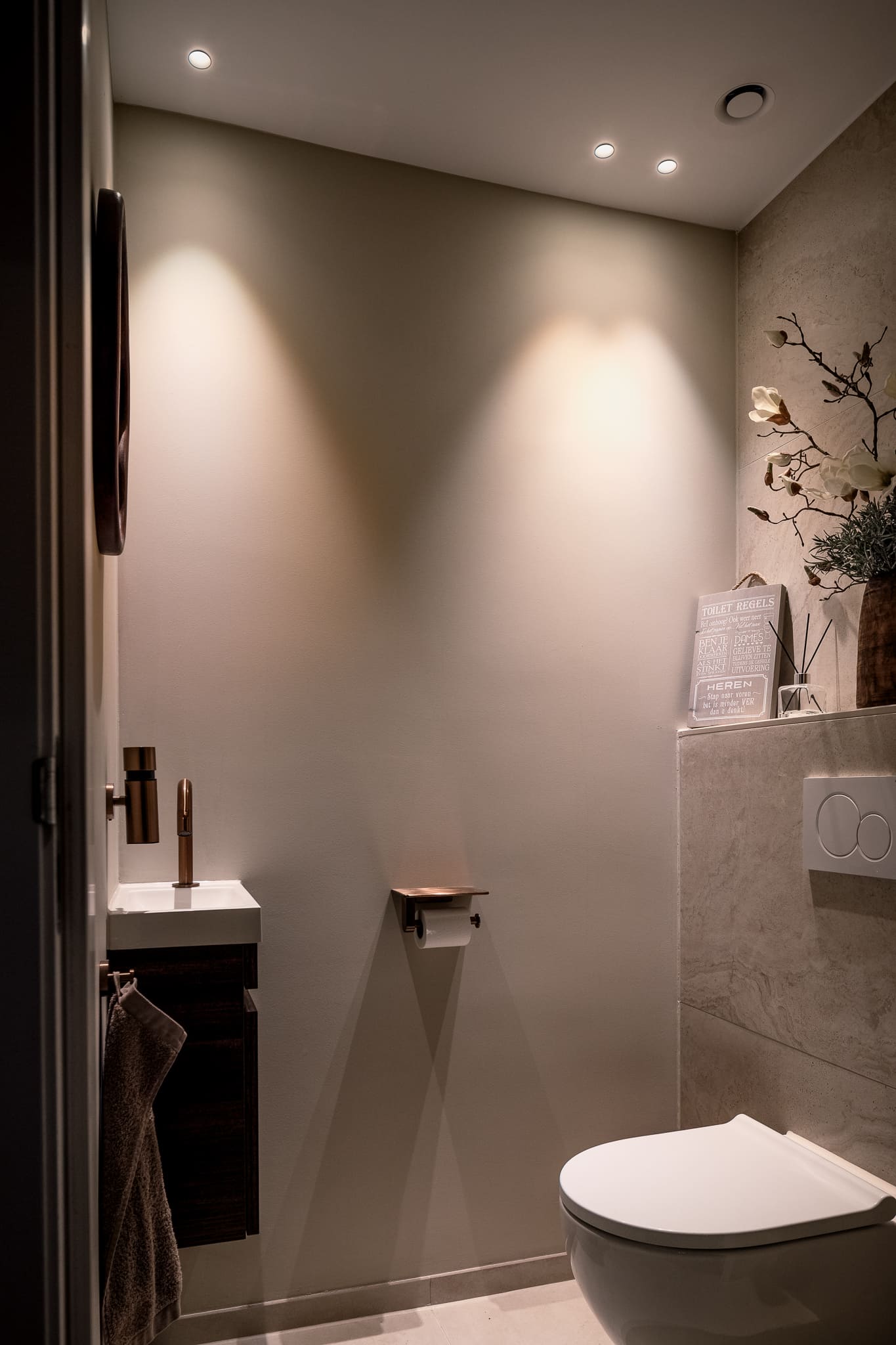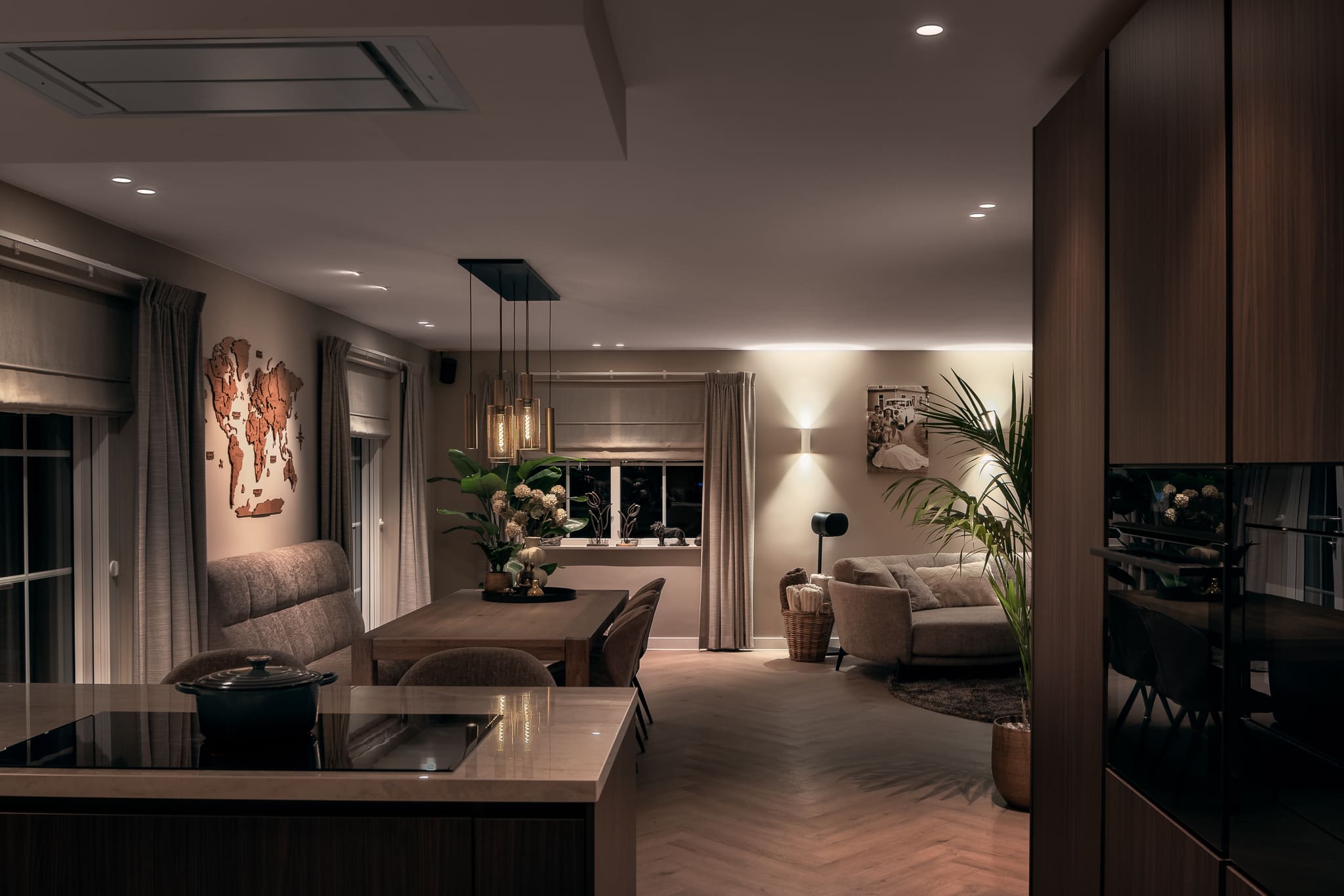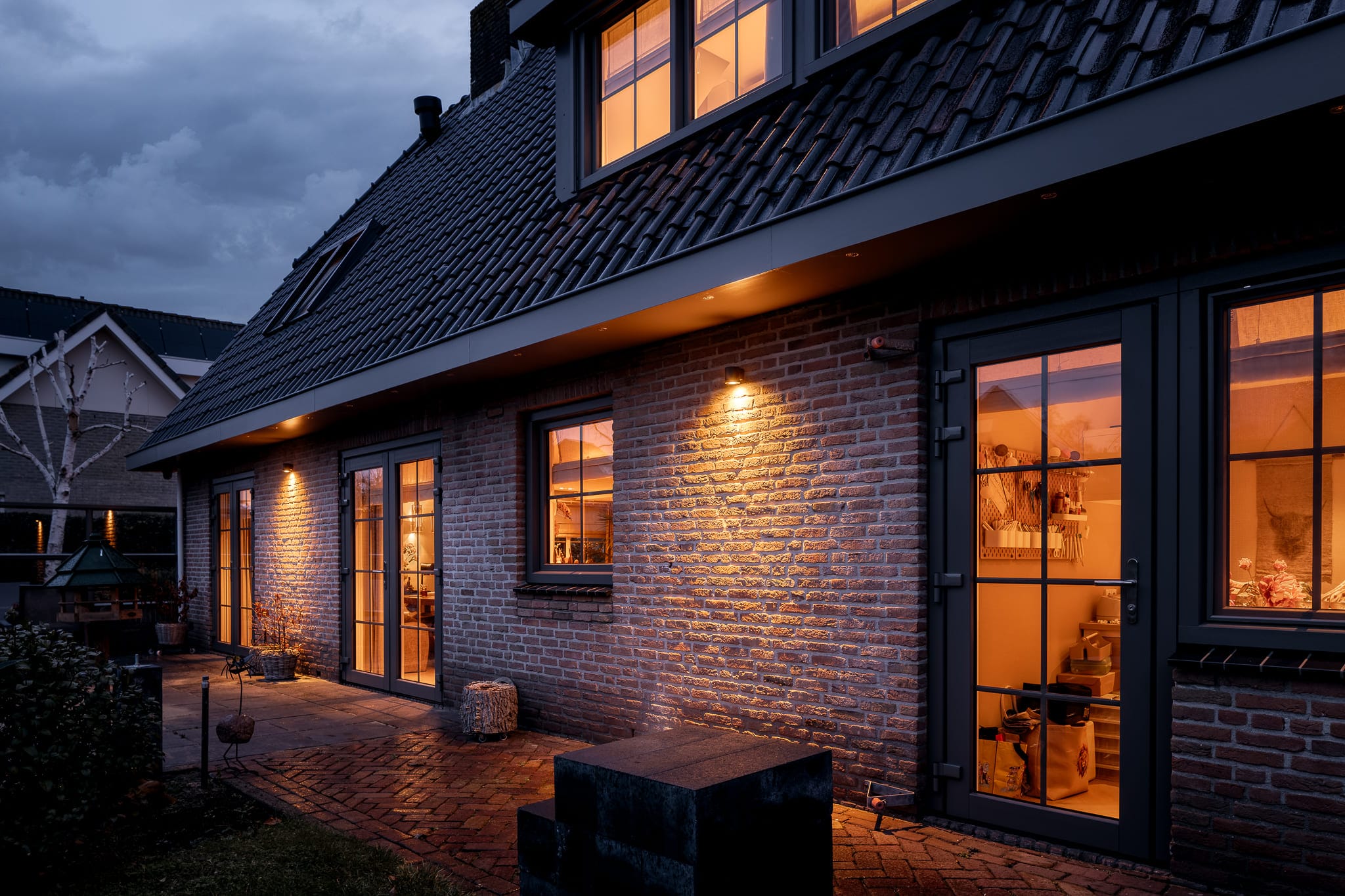 In dit project is gekozen voor volledig in het plafond geïntegreerde trimless richtspots, die zorgen voor een rustig en minimalistisch plafondbeeld zonder zichtbare armaturen. Door deze te combineren met gericht geplaatste accentverlichting worden gevels, wanden en specifieke materialen nauwkeurig aangelicht, waarbij vaste lichtbundels, bewuste armatuurposities en consistente lichttemperaturen zorgen voor een duidelijke visuele hiërarchie en een vloeiende overgang tussen binnen- en buitenruimtes, met een functionele én sfeervolle lichtbeleving als resultaat.